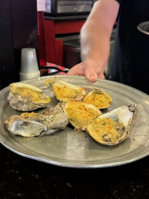 Baked on the half-shell with rocky sauce, spinach, and bread crumbs